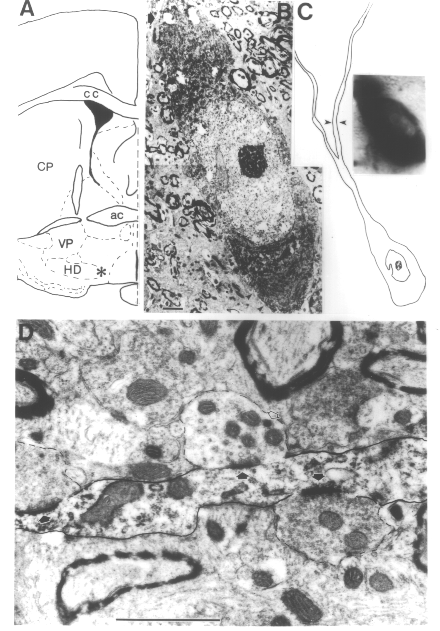 Figure 1.12.1.1. Electronmicrographs showing a cholinergic cell body (B) and a portion of its dendrite (D). A Asterisk indicates the location of the neuron, medial to the horizontal limb of the diagonal band (HD). CP, nucleus caudate putamen; VP, ventral pallidum; ac, anterior commissure; cc, corpus callosum; B Electron micrograph of the cell body. Large part of the plasmalemmal surface is covered by glial processes (arrowheads at lower right). At this plane only one synapse (arrow at upper left) is recognizable. C Schematic drawing of the neuron. Arrowheads denote the portion of the dendrite shown in (D). Insert is a photomicrograph from the cell body. D Electron micrograph showing several boutons in close associations (synapses are indicated by arrows) with this dendrite. Open arrow points to a large dense core vesicle reminiscent of a neurophysin-containing neurosecretory granule. Scale: B: 2 µm; D: 1 µm.
